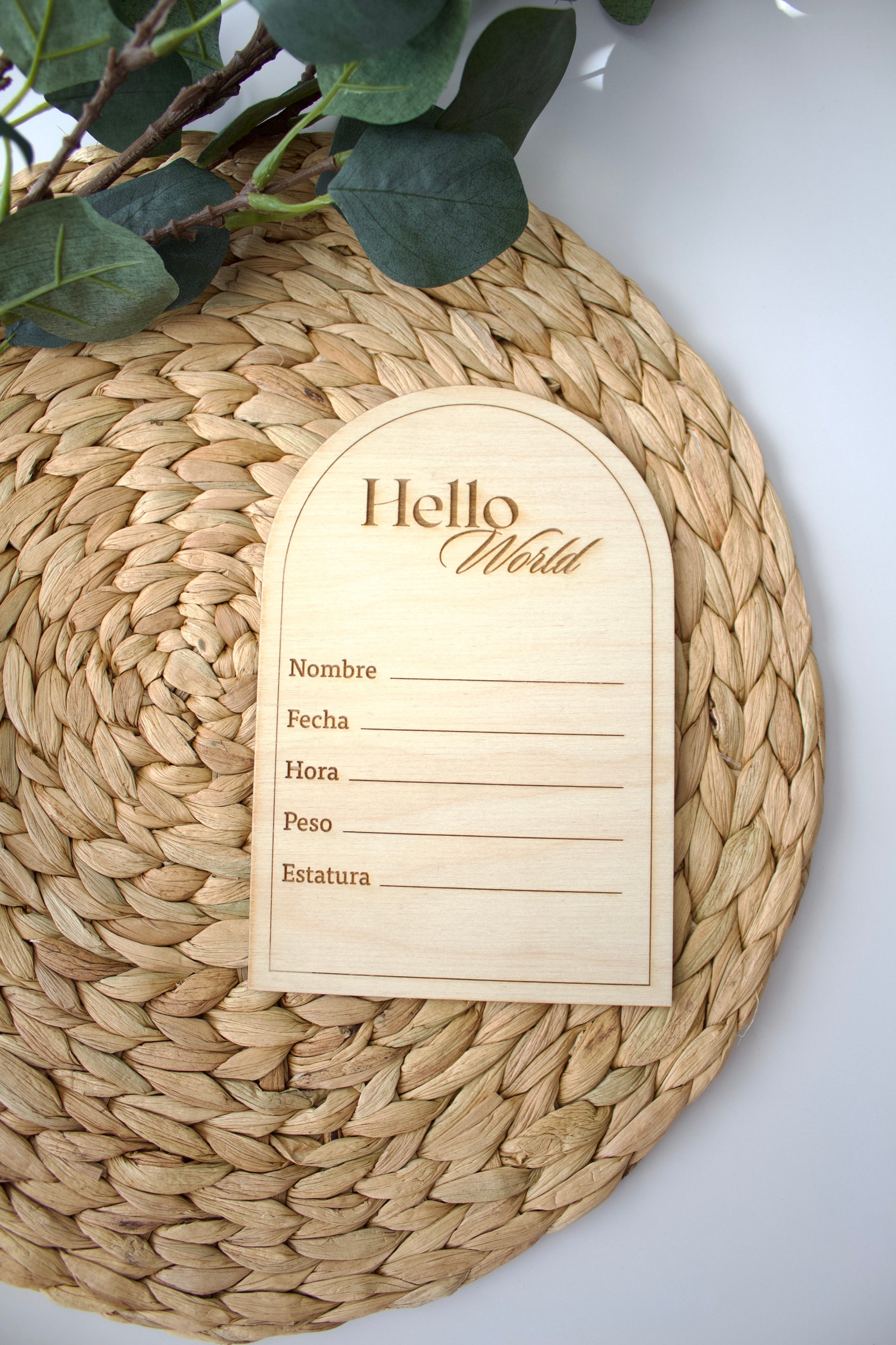 Cartel de anuncio para recién nacido en madera, diseñado para escribir el nombre del bebé, fecha de nacimiento, peso y medida en un estilo natural y atemporal. Fabricado en madera lisa de alta calidad, fácil de escribir con pluma o marcador. Ideal para fotos en el hospital, decoración del cuarto o guardar como recuerdo especial del día de su llegada.
